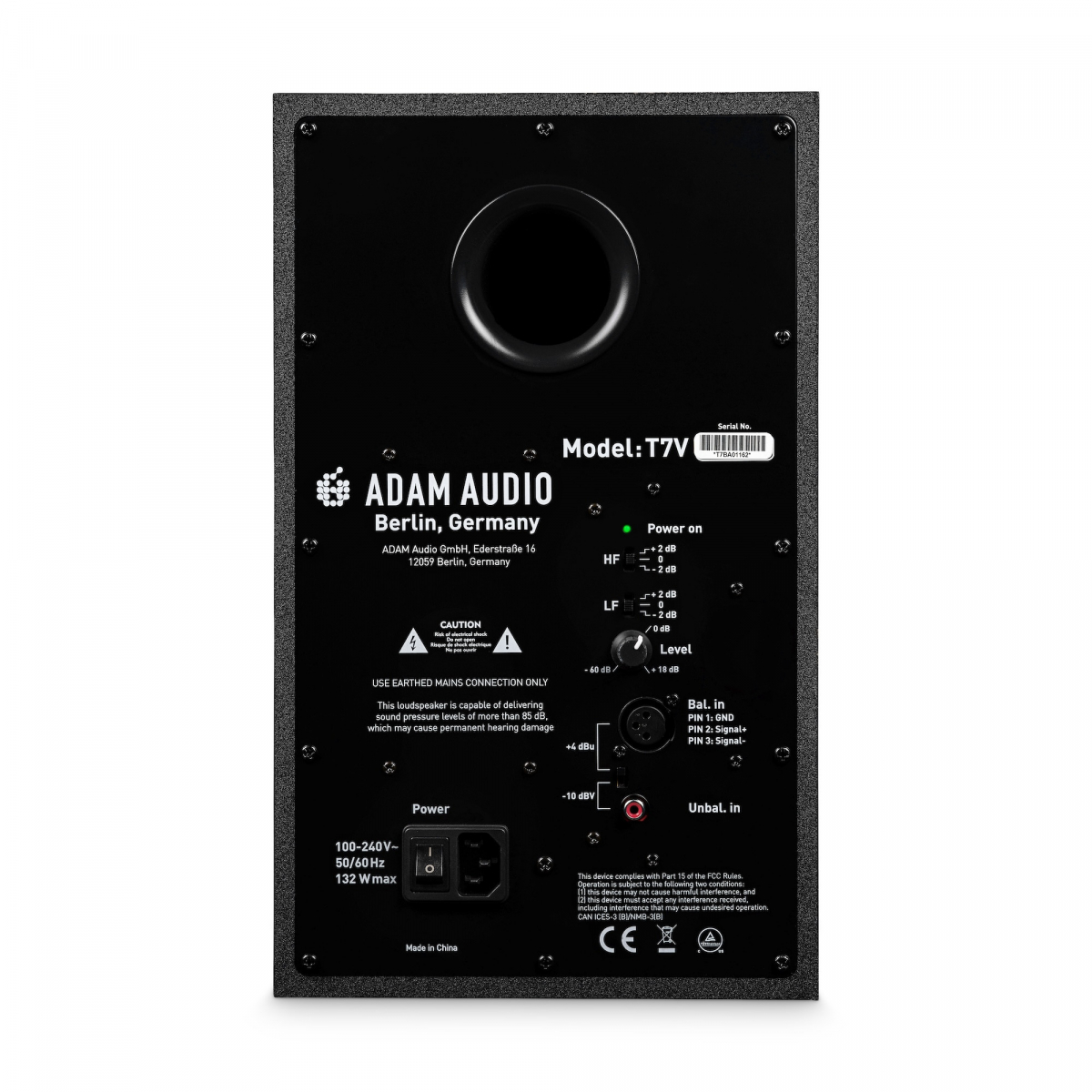 På baksidan av T7V fasade kabinett finns en bakåtriktad basreflexport tillsammans med en robust metallplatta som rymmer de analoga ingångsanslutningarna. U-ART-diskanten drivs av en 20 W klass D-förstärkare, medan en 50 W klass D-förstärkare driver basen. Dessa kraftpaket ger en imponerande maximal ljudtrycksnivå på 110 dB per par.