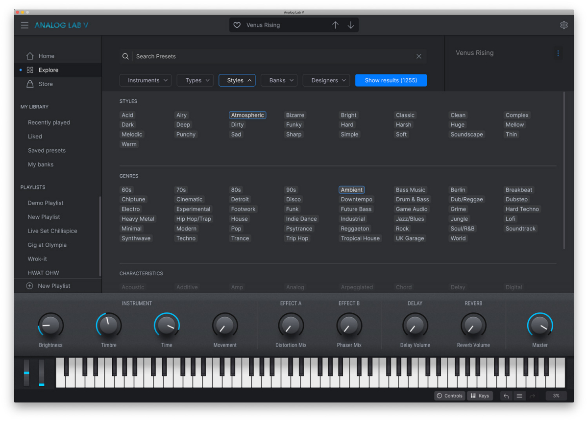 Analog Lab Pro ger dig omedelbar tillgång till förinställningar från alla instrument i V Collection, i ett smart gränssnitt med 28 historiska keyboards.
