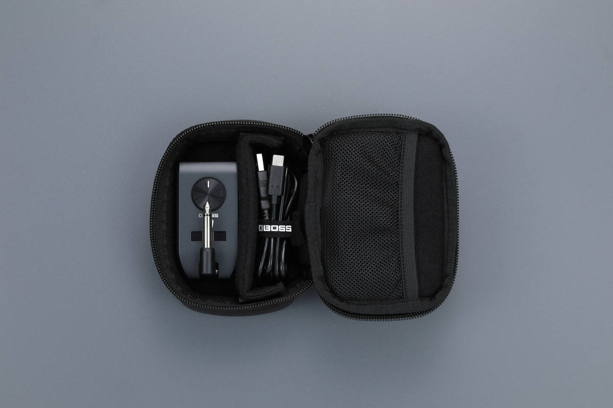 The CB-KTNGO pouch provides a main pocket for KATANA:GO and its charging cable, and there’s a convenient cable tie to keep things tidy. There’s also a mesh pocket in the lid, perfect for stowing earbuds, picks, and other small accessories. The internal divider in the main pocket can be adjusted or removed to carry alternate items, such as the compact BOSS WL-20/WL-20L and WL-30XLR wireless systems.