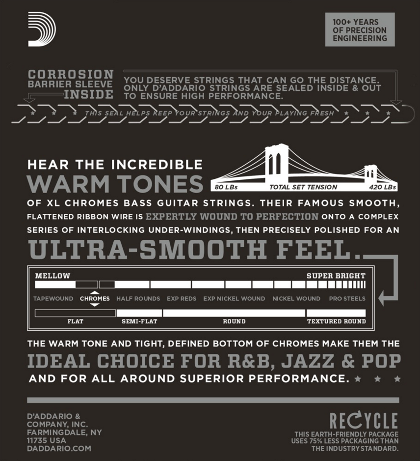 D'Addarios bästsäljande slipade strängar. Strängarna har slipats och polerats i tre olika steg för att få en slät och fin yta. Känt för sin runda, mjuka och varma ton levererar strängarna en djup och mycket rik bas vilket har gjort dem mycket populära inom Jazz, Pop och R&B.