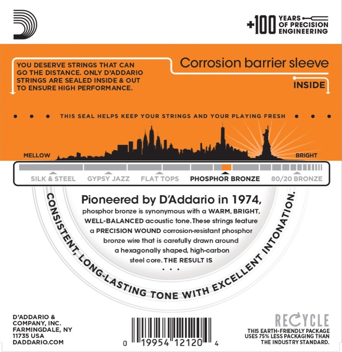 Sedan 1974 har D'Addarios phosphor bronze strängar varit synonymt med varm, glittrig och välbalanserad gitarrton. Strängarna är precisionslindade med rostbehandlad phsophor bronze runt en hexagobal kolstålskärna. Resultatet är en långlevad sträng som ger en fyllig gitarrton med superb intonation.