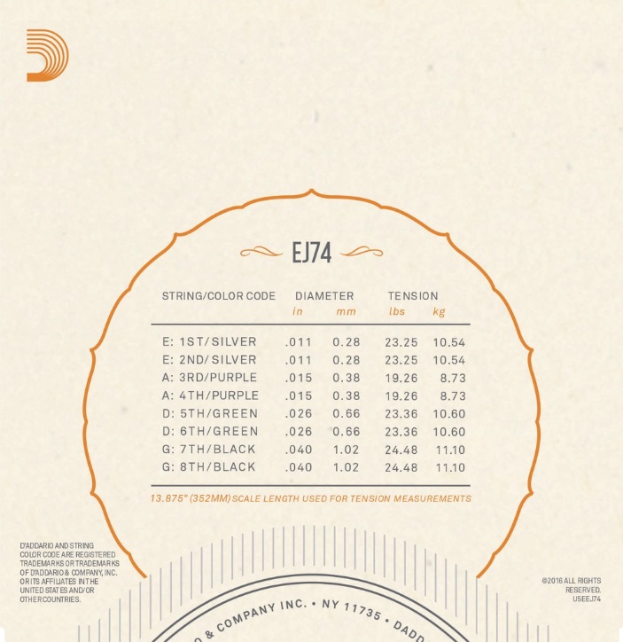 - Strängtjocklekar .011, .011, .015, .015, .026, .026, .040, .040