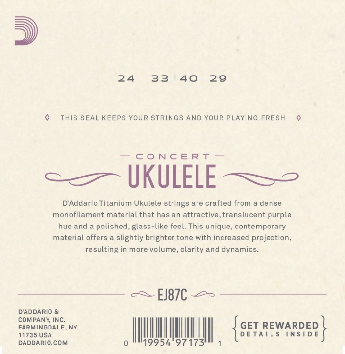 D'Addario's EJ87C är ukulelesträngar designade för concertukuleles. Varje sträng är tillverkad av D'Addario's egna titaniummaterial som har en mycket modern, distinkt och tydlig ton med bra projektion.
