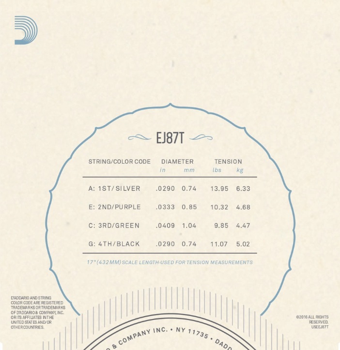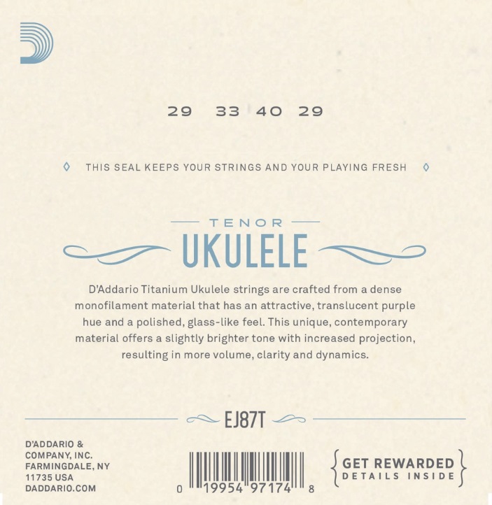 D'Addario's EJ87T är ukulelesträngar designade för tenorukuleles. Varje sträng är tillverkad av D'Addario's egna titaniummaterial som har en mycket modern, distinkt och tydlig ton med bra projektion.