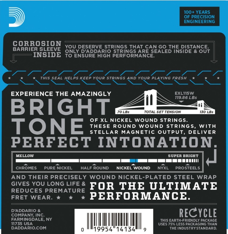 D'Addarios XL Nickel Wound är deras mest använda och omtyckta elgitarrsträng. Nickelpläterat stål, spunnet på en hexagonal kärna ger en flexibel sträng med en distinkt och klar ljudkaraktär i kombination med klockren intonation. Har sedan 60-talet varit det självklara valet av gitarrsträngar för många olika gitarrhjältar.