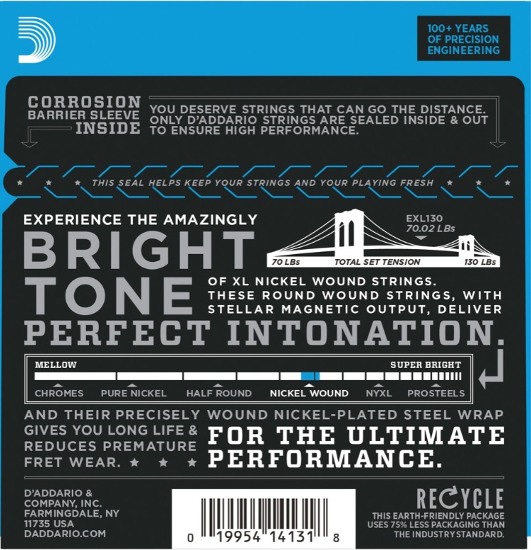 D'Addarios XL Nickel Wound är deras mest använda och omtyckta elgitarrsträng. Nickelpläterat stål, spunnet på en hexagonal kärna ger en flexibel sträng med en distinkt och klar ljudkaraktär i kombination med klockren intonation. Har sedan 60-talet varit det självklara valet av gitarrsträngar för många olika gitarrhjältar.