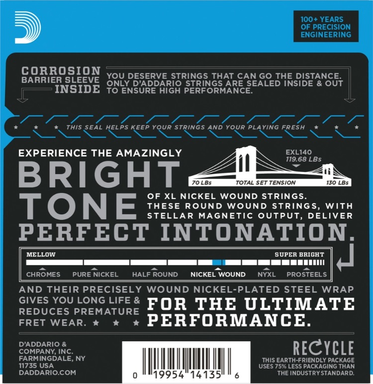 D'Addarios XL Nickel Wound är deras mest använda och omtyckta elgitarrsträng. Nickelpläterat stål, spunnet på en hexagonal kärna ger en flexibel sträng med en distinkt och klar ljudkaraktär i kombination med klockren intonation. Har sedan 60-talet varit det självklara valet av gitarrsträngar för många olika gitarrhjältar.