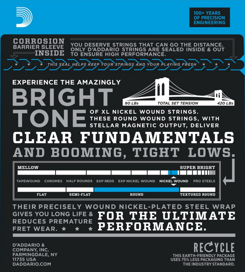 XL Nickel serien är D’Addarios absolut mest populära. Nickelpläterat stål ger stark tydlig volym och en komfortabel jämn spelyta som reducerar för tidig utnötning av greppbrädesbanden. Klockren intonation med en ton som är väldigt distinkt och tydlig.