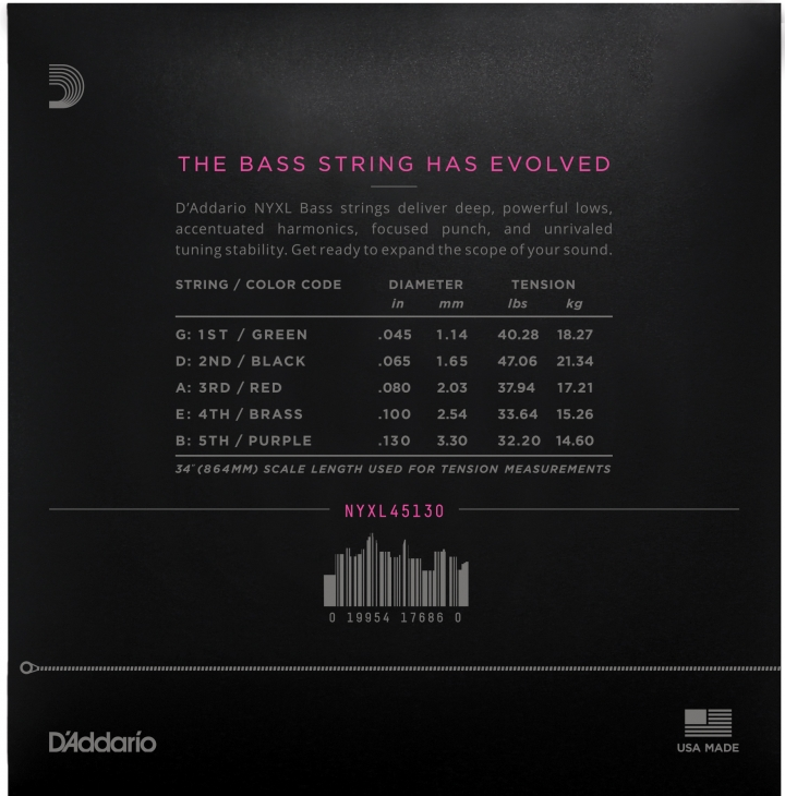 D'Addarios NYXL Bass kombinerar deras hexagonala stålkolkärna med en omgjord nickelpläterad stålspinning. Detta resulterar i en djup och fyllig baston med ett riktigt tajt och fokuserat mellanregister. Komplext övertonsregister, mer dynamik och längre sustain gör detta till en absurt bra och mångsidig sträng.