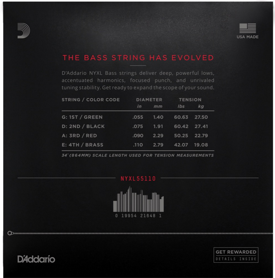 D'Addarios NYXL Bass kombinerar deras hexagonala stålkolkärna med en omgjord nickelpläterad stålspinning. Detta resulterar i en djup och fyllig baston med ett riktigt tajt och fokuserat mellanregister. Komplext övertonsregister, mer dynamik och längre sustain gör detta till en absurt bra och mångsidig sträng.