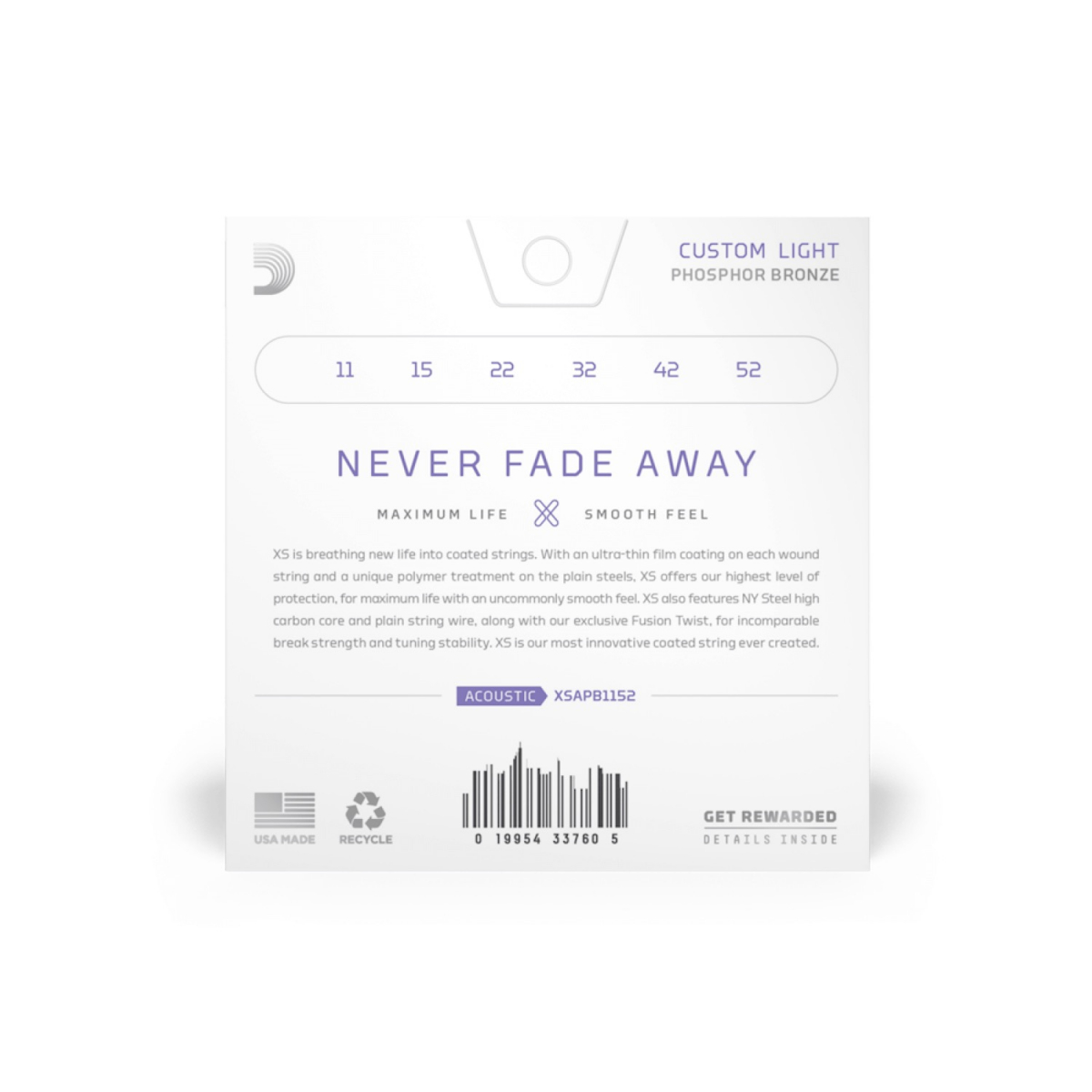 Varje enskild sträng i ett set XS är behandlad med D'Addarios skyddande mikrocoating, en supertunn ytbehandling som effektivt stöter bort smuts och svett. XS-strängarna varar 4ggr längre än traditionella o-coatade strängar utan att påverka den ton och spelkänsla som D'Addarios strängar blivit erkända för. D'Addarios unika stålkolkärna i kombination med en stark förankring av kulan, genom sk Fusion Twist technology, ger en sträng med oöverträffad styrka och som håller stämningen avsevärt bättre än vanliga strängar.