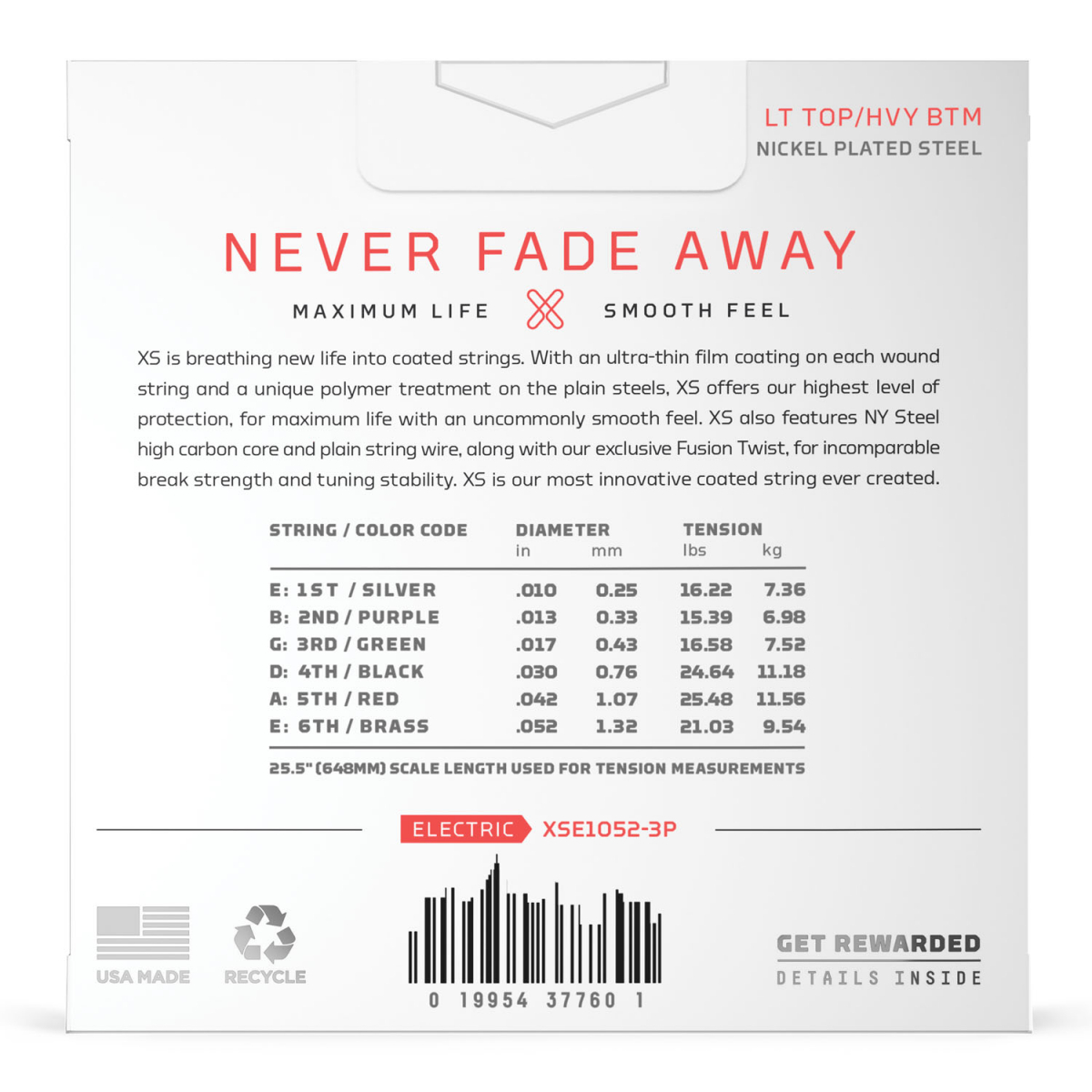 Med en ultratunn coating-film på de spunna strängarna och en unik polymerbehandling på de ospunna så erbjuder XS maximal livslängd i kombination med en mjuk och slät spelkänsla. XS har NY STEEL kolstålkärna i kombination med Fusion Twist förankring av kulan vilket ger en sträng med oöverträffad styrka och stämningsstabilitet.