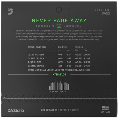 Varje enskild sträng i ett set XT är behandlad med D'Addarios skyddande mikrocoating, en supertunn ytbehandling som effektivt stöter bort smuts och svett. XT-strängarna varar 4ggr längre än traditionella o-coatade strängar utan att påverka den ton och spelkänsla som D'Addarios strängar blivit erkända för. D'Addarios unika stålkolkärna i kombination med en stark förankring av kulan, genom sk Fusion Twist technology, ger en sträng med oöverträffad styrka och som håller stämningen avsevärt bättre än vanliga strängar.
