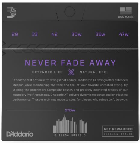 XT classic kommer med D'Addarios Pro-Arté komposit-bassträngar vilket ger en rik och kraftfull ton med mycket värme och som genererar en perfekt tonövergång mellan de spunna och ospunna strängarna. Lindningen är behandlad med D'Addarios skyddande mikrocoating, en supertunn ytbehandling som effektivt stöter bort smuts och svett. Detta är ett set strängar med oöverträffad dynamisk respons, med perfekt intonation och som varar länge.