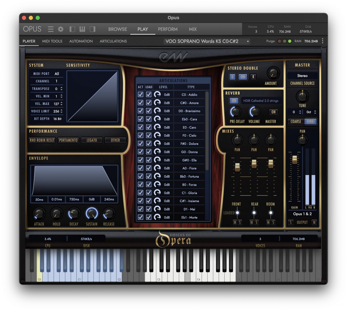 - Words: 42 vocal instruments with performances of specific Italian words mapped chromatically across the keyboard. For both Soprano and Tenor, these include: Addio, Amore, Bravissimo, Cara, Caro, Cielo, Dolore, Donna, Ella, Fiore, Fortuna, Forza, Gloria, Insieme, Mai, Morte, Nobilta, Potere, Sacro, Signore, Vincero.