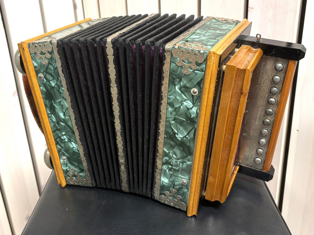 Ibland får man in lite extra roliga begagnade saker...! Enradigt dragspel, äldre modell från okänd tillverkare i Ryssland. Extra krydda att två av knapparna i basen också är kopplade till ringklockor som ljuder vackert när man spelar. Fint skick!