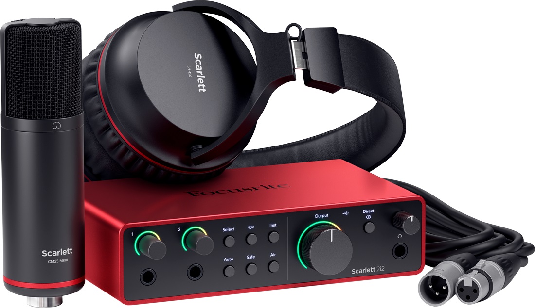 Komplett studiopaket med ljudkort, mikrofon, hörlurar och kablage. Stort mjukvarupaket ingår också. Fjärde generationen av storsäljande Scarlett serien är här. Nya A/D omvandlare tagna från RedNet serien, Auto-Gain, Clip Safe och massa fler nya funktioner som gör dem väldigt populära Scarlett ljudkorten ännu mera prisvärda.
