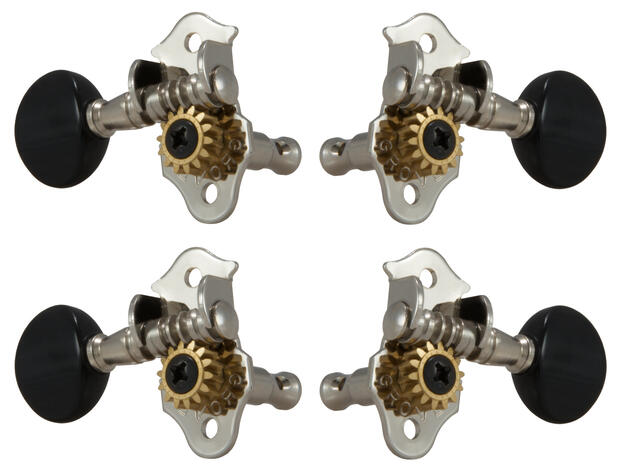 The one-piece back plate, brass gear, die cast button and knurled bushings are the same as those used on the Sta-Tite™ guitar machine head. The string post has been shortened to 1 inch with the string hole .630″ from the back of the base. 14:1 gear ratio provides for accurate tuning. Includes bushings and wood screws.