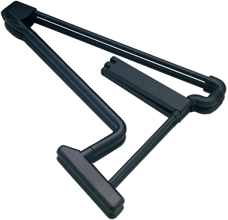 Ställ för elgitarr och elbas. Mycket smart konstruktion som viks ihop för smidig transport, men ändå väldigt stabilt.