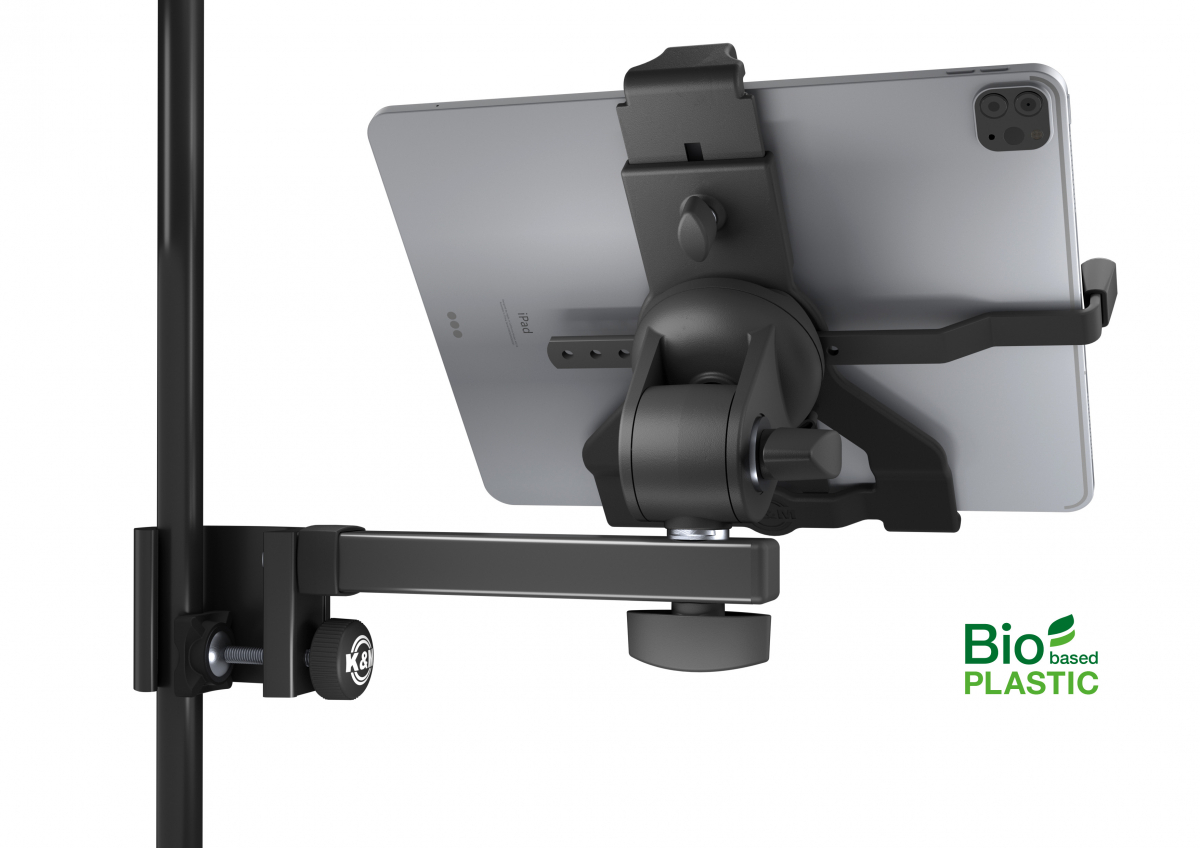 Universal hållare för iPad eller andra surfplattor. Mycket stabil konstruktion och lätt att ställa in i rätt storlek. Sätts fast på exempelvis mikrofonstativet. Tillverkad av miljövänlig bio-plast.