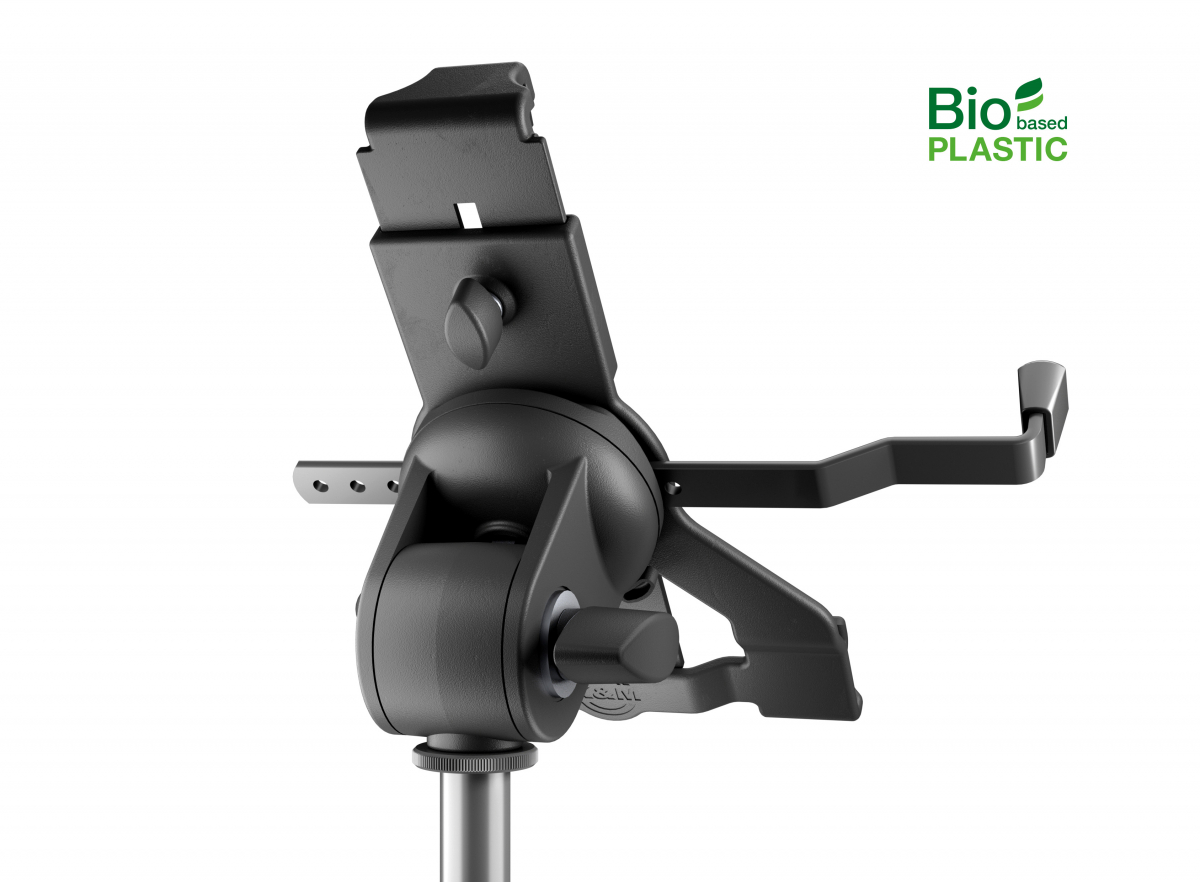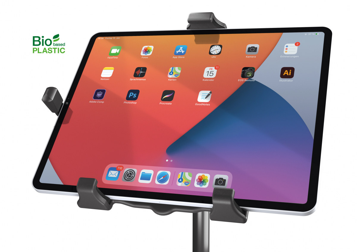 Universal hållare för iPad och andra surfplattor. Mycket stabil konstruktion, gängas fast på valfritt mikrofonstativ. Tillverkad av miljövänlig bioplast.