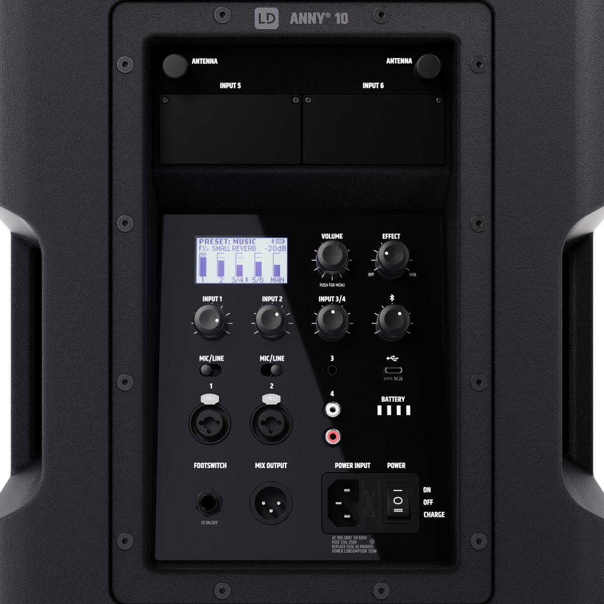 Med en integrerad 6-kanalsmixer, 3-bands EQ, 5 förinställningar (MUSIC, LIVE, VOCAL, ECO, FLAT) och effekter som reverb & delay, kombinerar den omfattande funktioner och enastående ljudkvalitet i en kompakt och robust design. ANNY 10 imponerar med sina mångsidiga anslutningsmöjligheter: två mikrofon-/line-kombinationsingångar, en stereokanal med 3,5 mm AUX och RCA-ingångar samt Bluetooth 5.0 med AAC-codec.