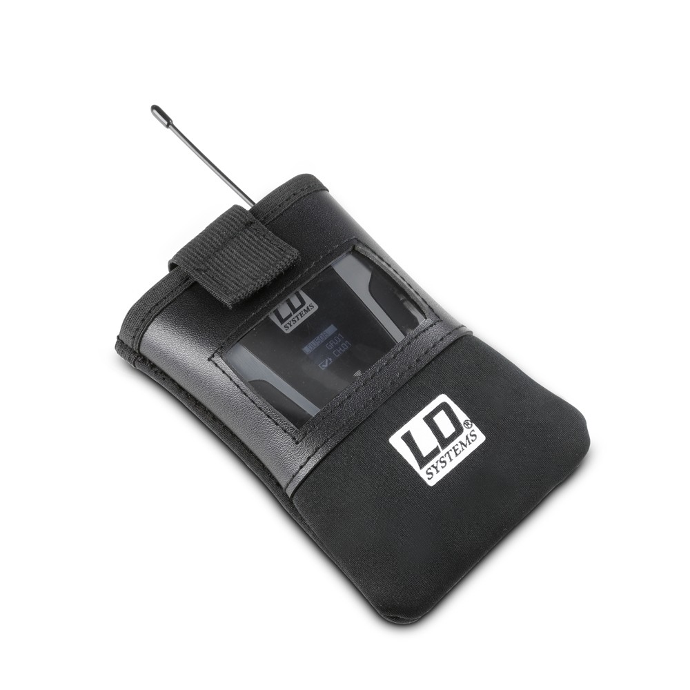 This bag made of durable neoprene and artificial leather protects your body-pack transmitter from soiling and impact. It provides direct access to the inputs for the antenna and instrument cable. It also has a window for the display, a Velcro fastener and a feedthrough for the transmitter belt clip. It can be closed either by Velcro fastener or using the elastic Velcro strap for a secure hold. The bag is suitable for all LD Systems body-packs as well as those of other makes.