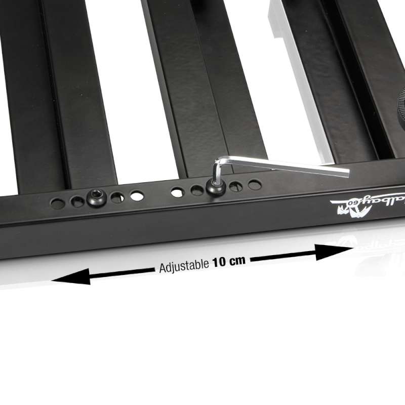 Pedalbord i aluminium för dina effektpedaler. Både cross bars, höjd samt vinkel kan justeras individuellt. På cross bars sitter velcro tejpen redan på plats och det följer med gummi straps för att fästa eventuell strömförsörjning under pedalbordet.
