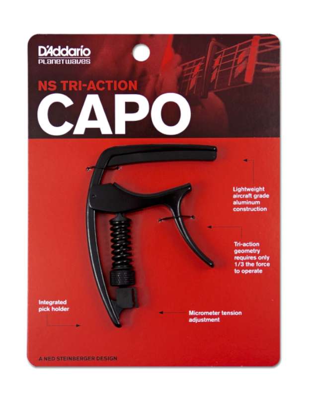Med skruvmikrometern justerar man trycket till en perfekt nivå för instrumentet, lagom så att inte surr uppstår vid spelning. Med spaken kan man sedan flytta capon snabbt mellan olika band. Som med övriga NS capos använder man sig av ultra-lätt aluminium material.