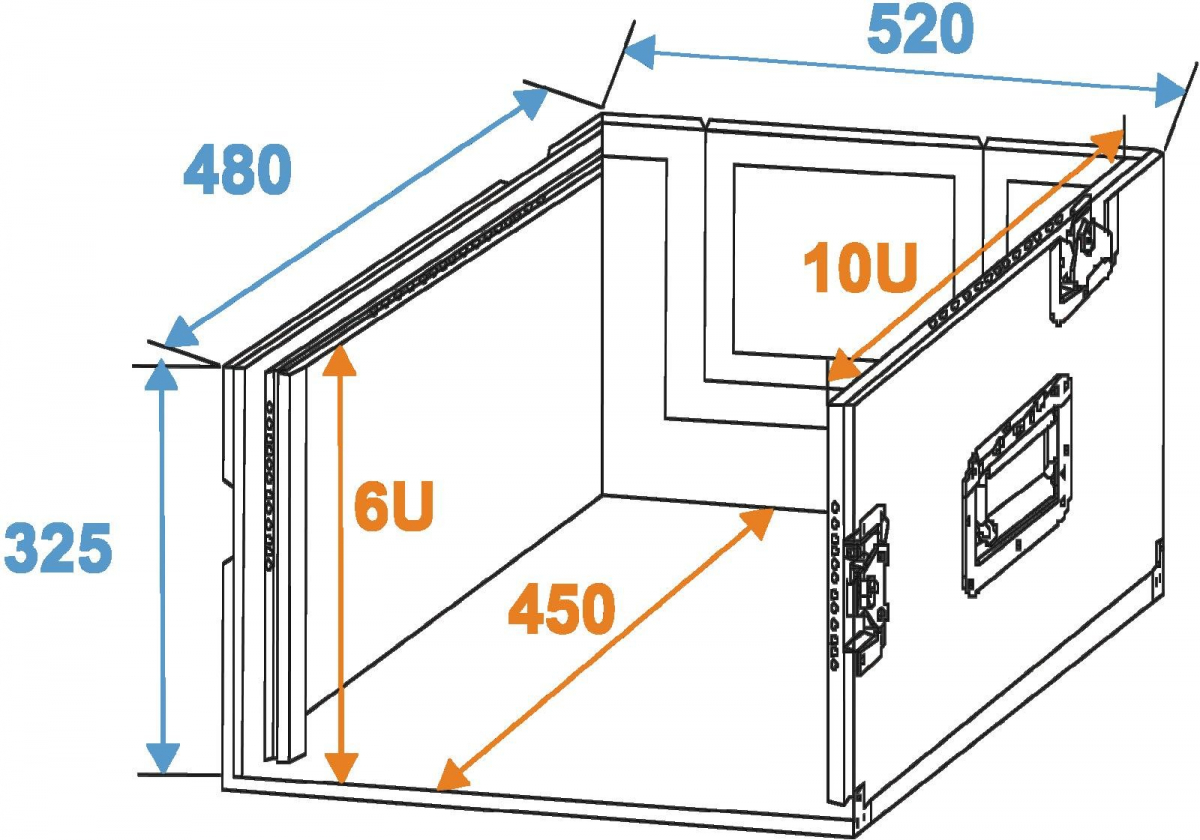 - 10U section (top) with profile rails with for top-operated units e.g. mixers, control units of DJ CD players