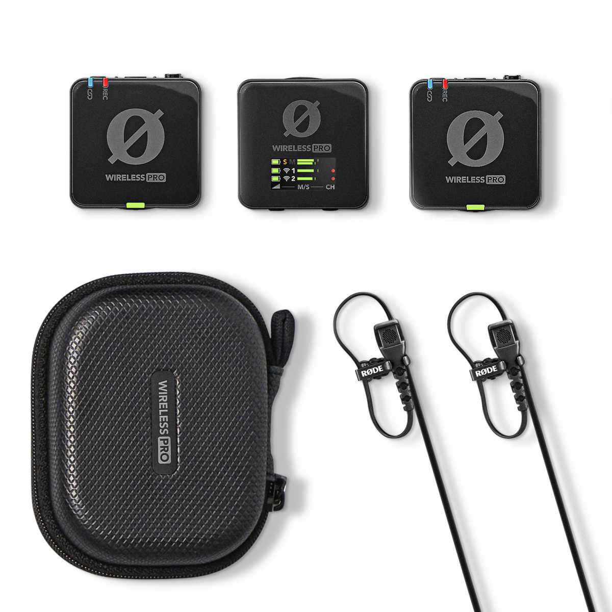 - Komplett tillbehörspaket ink. Smart Charging Case, 2st Røde Lavalier II mikrofoner, alla nödvändiga kablar, MagClip GO magnetiska clips och tillbehörsetui