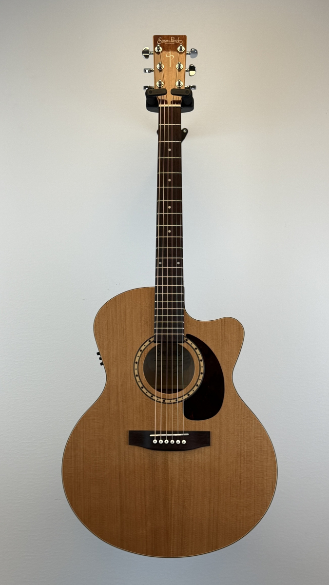 Simon & Patrick Woodland CW Mini Jumbo i mycket gott skick. Handbyggd i Kanada med solid topp som ger varmt, fylligt ljud och inbyggd mick med B-Band preamp. Bekväm hals och cutaway för enkel åtkomst till högre band. Tric case ingår.