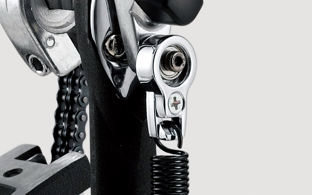 TAMA eliminated another source of friction by replacing the traditional nylon rocker cam with the Speedo-Ring, a rocker cam with a high quality built-in ball bearing rocker. The Quick-Hook not only allows for easy setup and tear-down but also streamlines the pedal, allowing quick stowaway in the hard case without removing the beater.