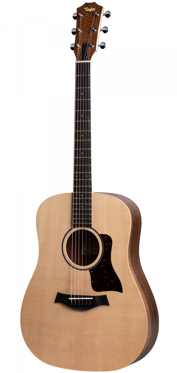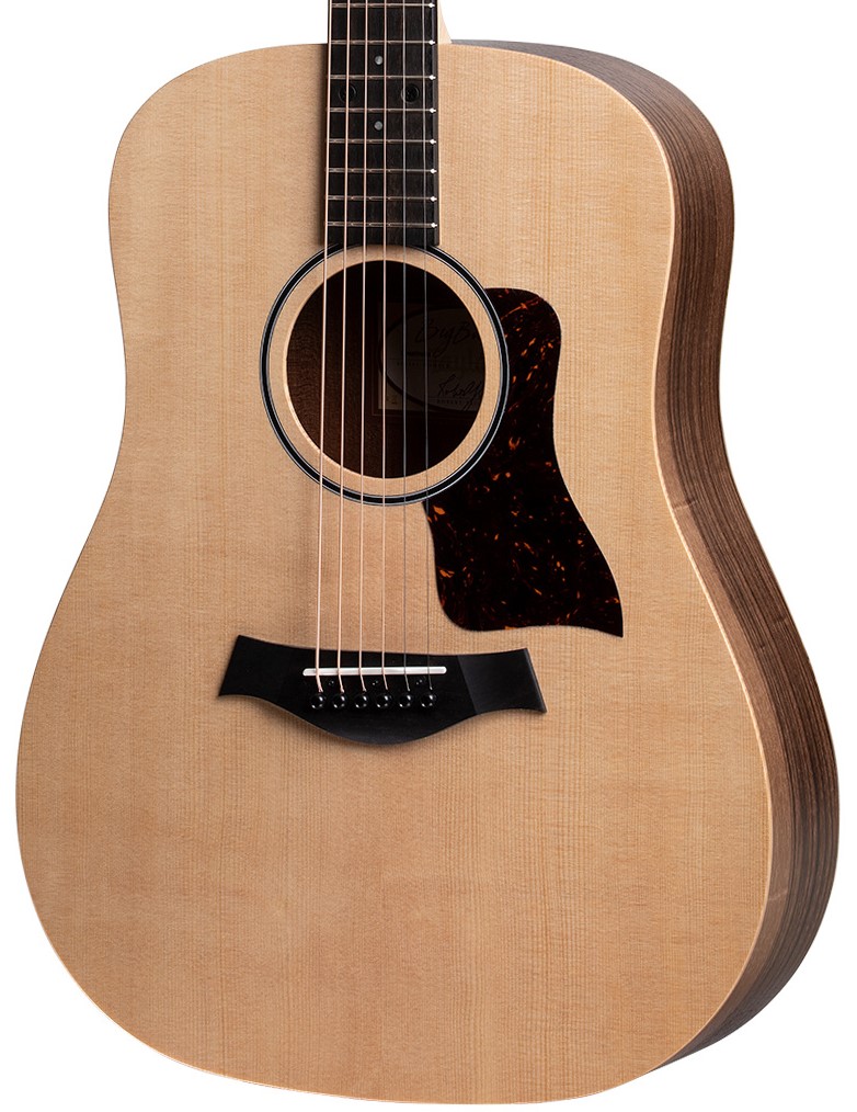 Taylor Big Baby BBT är trots sitt lite mindre format [ 15/16 scale ] en otroligt välljudande gitarr med mycket volym. Liten och smidig men ändå med ett stort akustiskt ljud och mycket volym. Taylors kvalité saknas inte bara för att detta är en av deras billigare modeller, här finns ändå solid Sitka gran i locket, valnöt i sidor/botten och greppbräda av ebenholts.