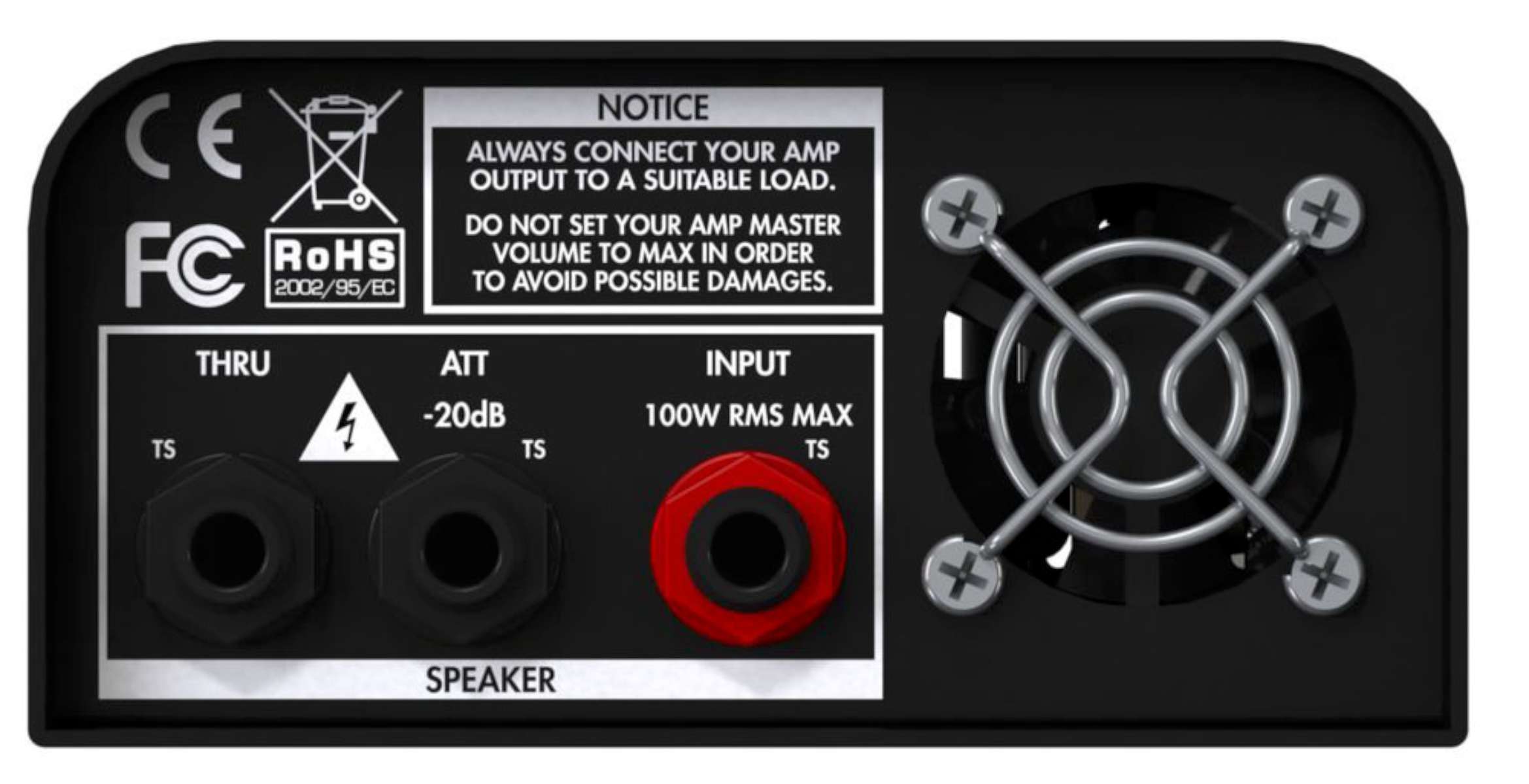 - Speaker Thru: 1/4″ Jack unbalanced (TS) – Directly connected to Speaker Input. Disconnects the load box when used.