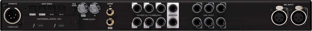 - Two Unison™ mic preamps, two Hi-Z instrument inputs, six 1/4" line inputs, two optical Toslink I/O (ADAT S/MUX), RCA coaxial I/O (S/PDIF), word clock I/O (BNC)