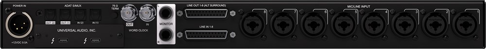 - Eight UnisonTM mic preamps, two Hi-Z instrument inputs, DB-25 input (line 1-8), two optical Toslink I/O (ADAT S/MUX or S/PDIF), word clock I/O (BNC)