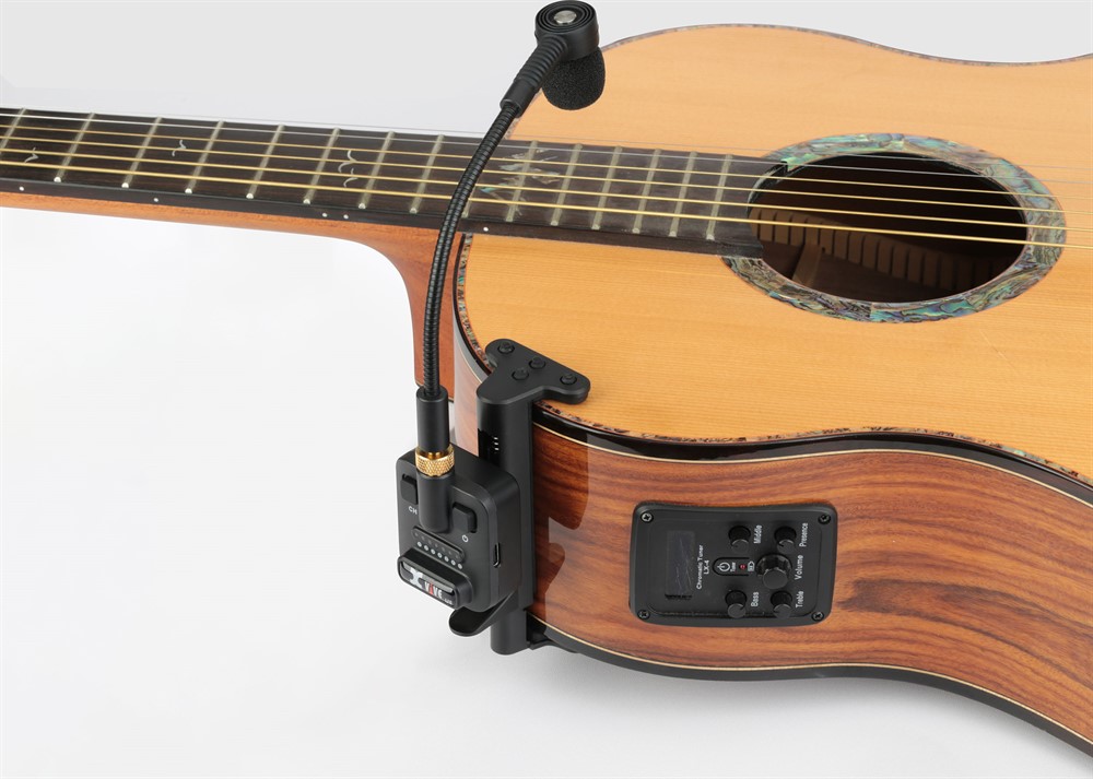 Systemet använder en supercardioid kondensatormikrofon med flexibel gooseneck-design, optimerad för placering på akustiska instrument.